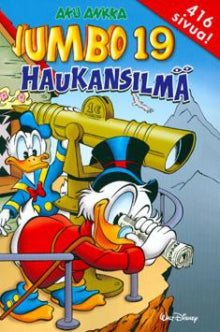 Jumbo 19: Haukansilmä tarjoaa läkähdyttävää menoa, sillä yksi jos toinenkin kirjan sankari on joutunut tahtoen tai tahtomattaan saalistusretkelle: sudenpentujohtaja K.A.M.M.O. etsii naamiaisasuaan ja Matami Mimmi täydellistä vahtikissaa, Roope-setä jäljittää Akun ja ankanpoikien avustuksella milloin kauan sitten kadonnutta Verneri-serkkuaan, milloin äärimmäisen harvinaisia postimerkkejä, Karhukopla janoaa tapansa mukaan aina vain suurempia ryöstösaaliita ja Milla Magia mitäpä muuta kuin Roopen ensilanttia. Eikä siinä vielä kaikki, sillä jossain vaiheessa näyttää siltä kuin koko Ankkalinna tahtoisi päästä perille Akun kouluttamien kyyhkysten lentoreiteistä.Mukana on Ankkain suvun edustajien lisäksi myös Mikki, joka joutuu samalla kertaa sekä Mustakaavun että Mustan Pekan pyöritettäväksi - ja Hessu, jonka esi-isien vaiheita valottaa tarina Hessu Kolumbus. Luvassa on siis huimia seikkailuja, joissa metsästetään niin menneen maailman mantereita kuin tämän päivän Ankkalinnan kurjimpia konnia. Pitäkää hatuistanne kiinni!