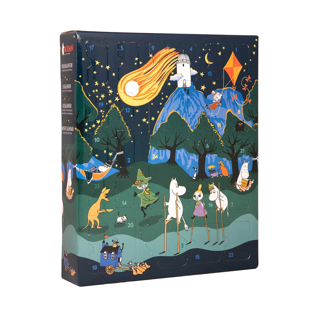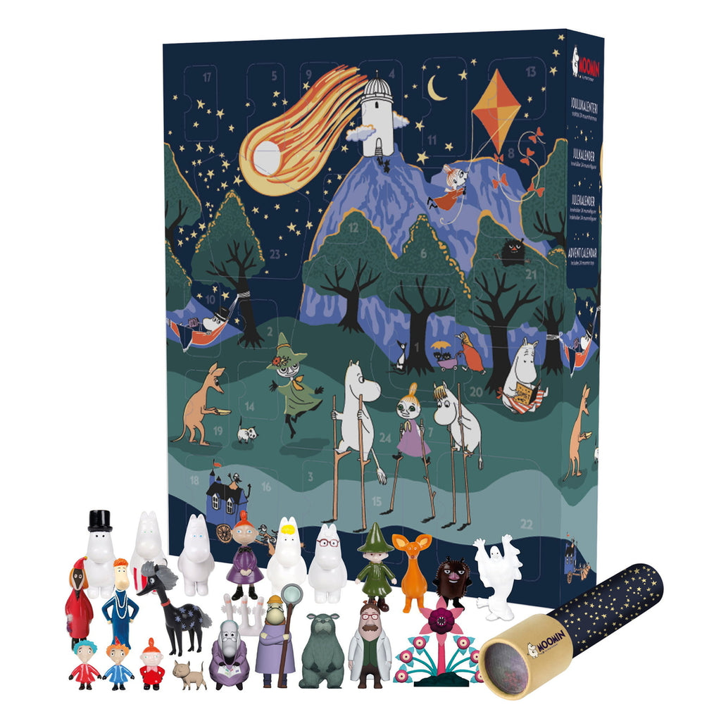 ...Kuulehan nyt, sanoi Nuuskamuikkunen. Minä tiedän, että seikkailutarinoissa aina pelastutaan… Tove Janssonin kirjoittamassa Muumipeikko ja Pyrstötähti -tarinassa on seikkailua kerrakseen. Hyppää mukaan joulun odotukseen ihastuttavan Muumiaiheisen kalenterin kanssa, löydä yllätyksiä ja kurkistele taivaalle kaleidoskoopin kanssa!