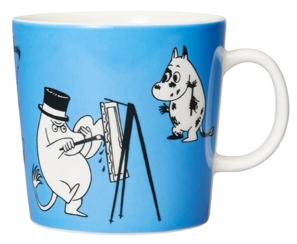 Sininen-muki kuvituksessa nähdään koko Muumiperhe puuhastelemassa taiteen parissa. Muumipeikko tekee kirjaimia ja hän on onnistunut sotkemaan itsensä maaliin. Muumimamma taiteilee kuvia itsestään ja Muumipappa puolestaan maalaa öljyväreillä. Teema-muotoon suunniteltu Muumi-muki Sininen nyt uudessa, isommassa 0,4 L koossa.